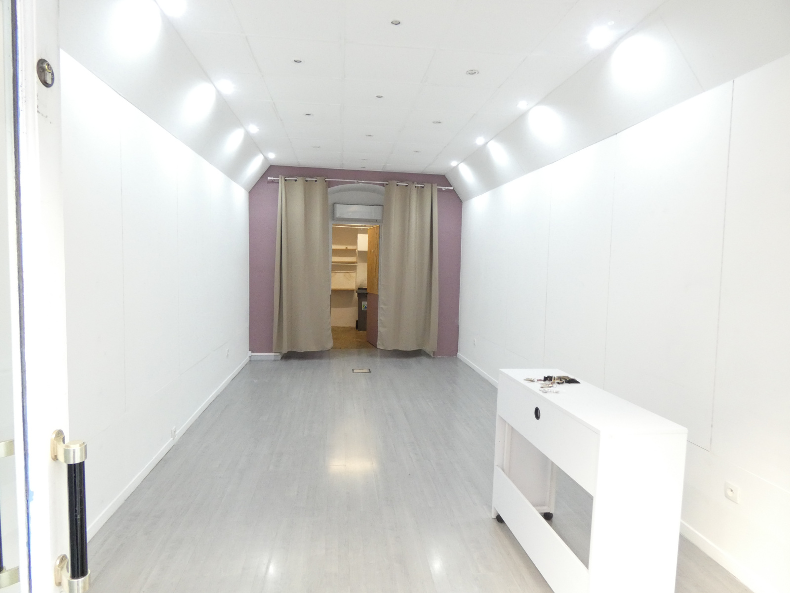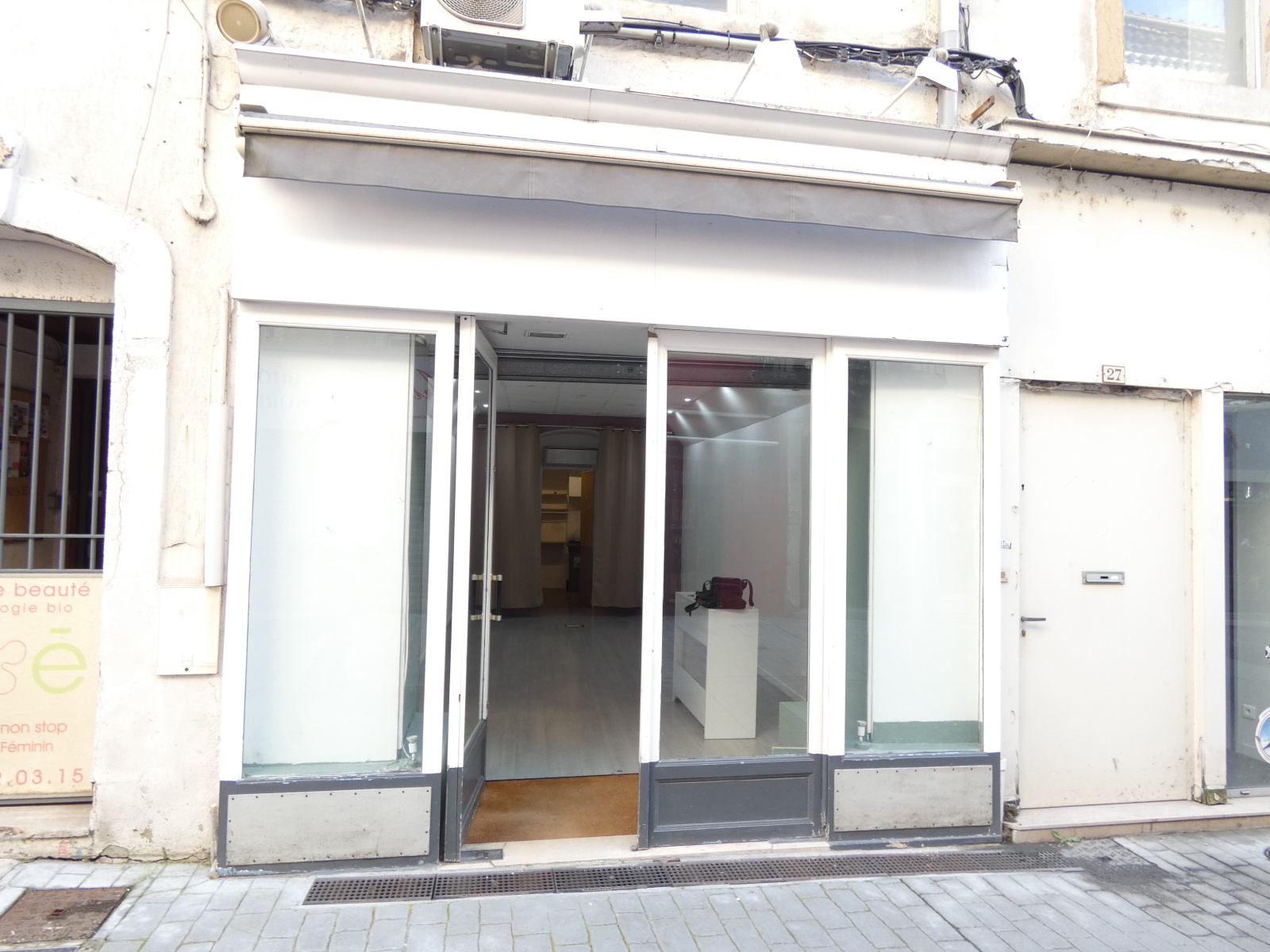 Espace semi-piéton de la rue d'Avéjan, local commercial en trés bon état avec climatisation, volet roulant métallique électriuqe antivol, arrière boutique avec toilettes.
